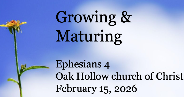 On February 15, 2026, Benjamin Meade delivered a heartfelt sermon titled "Growing & Maturing" to the Oak Hollow church of Christ, addressing the congregation as a recently established body of believers. Using Ephesians 4:11–16 as his primary text, he highlighted two key principles for a thriving new congregation: first, identifying and excellently employing each member's spiritual gifts and strengths in service (as exemplified by his basketball team's focus on unique contributions rather than size or athletic superiority); and second—and more centrally—prioritizing genuine spiritual maturity over mere numerical growth. Meade stressed that Christ gave apostles, prophets, evangelists, pastors, and teachers not merely to do all the work themselves, but to equip the saints for ministry, edify the body, foster unity in faith and knowledge of Christ, and promote maturity so the whole body grows together in love. Through personal anecdotes, cross-references to passages like 1 Peter 1, Philippians 3, and 2 Timothy 2, he challenged listeners to pursue daily individual growth, actively love and build up one another, and extend ministry outward, ensuring the church's long-term health stems from transformed lives rather than attendance figures alone. He closed by inviting anyone needing baptism, prayer, or study to respond during the invitation.